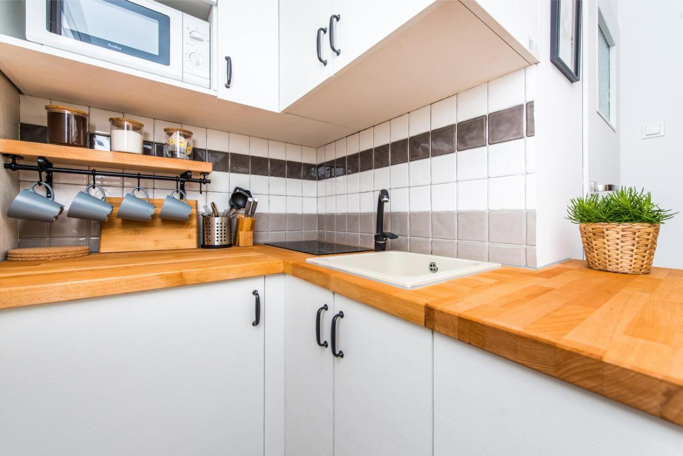 Wyposażenie obejmuje również lodówkę, mikrofalówkę, płytę kuchenną i czajnik.